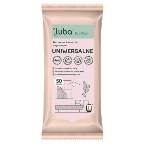 Luba EcoDom Ściereczki Czyszczące Uniwersalne to ekologiczne, nawilżane ściereczki przeznaczone do codziennego sprzątania różnych powierzchni w domu. Dzięki formule opartej w 96% na składnikach pochodzenia naturalnego, skutecznie czyszczą i odświeżają, jednocześnie pozostając przyjazne dla środowiska.