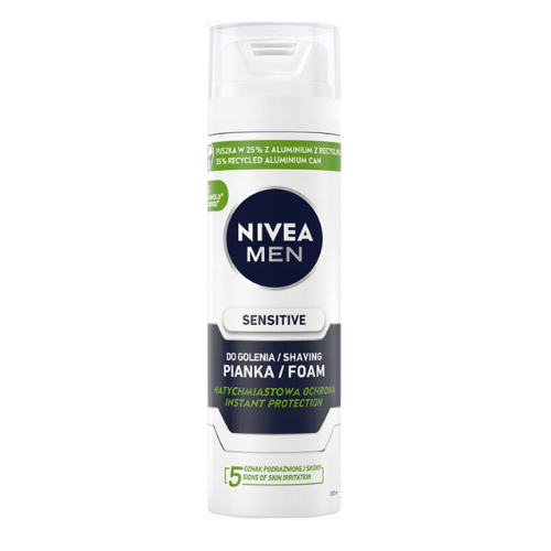Nivea Pianka Do Golenia Sensitive to delikatny kosmetyk przeznaczony dla mężczyzn o wrażliwej skórze. Dzięki swojej formule wzbogaconej o ekstrakt z rumianku i witaminę E skutecznie minimalizuje podrażnienia, zapewniając gładkie i komfortowe golenie. Pianka zmiękcza zarost, ułatwiając golenie bez podrażnień, a jej łagodna formuła bez alkoholu nie wysusza skóry.