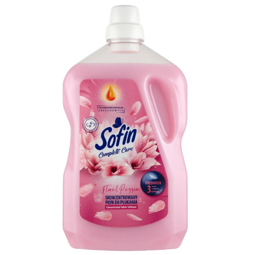 Sofin Complete Care & Freshness Floral Passion to skoncentrowany płyn do płukania, który otula tkaniny zmysłowym zapachem kwiatów i zapewnia długotrwałe uczucie świeżości. Formuła została wzbogacona o składniki pielęgnujące włókna – ubrania stają się miękkie, przyjemne w dotyku i łatwiejsze do prasowania. Płyn działa także antystatycznie, zapobiegając elektryzowaniu się ubrań. Duża butelka o pojemności 2,5 litra wystarcza aż na 100 prań – to wydajne i ekonomiczne rozwiązanie na co dzień.