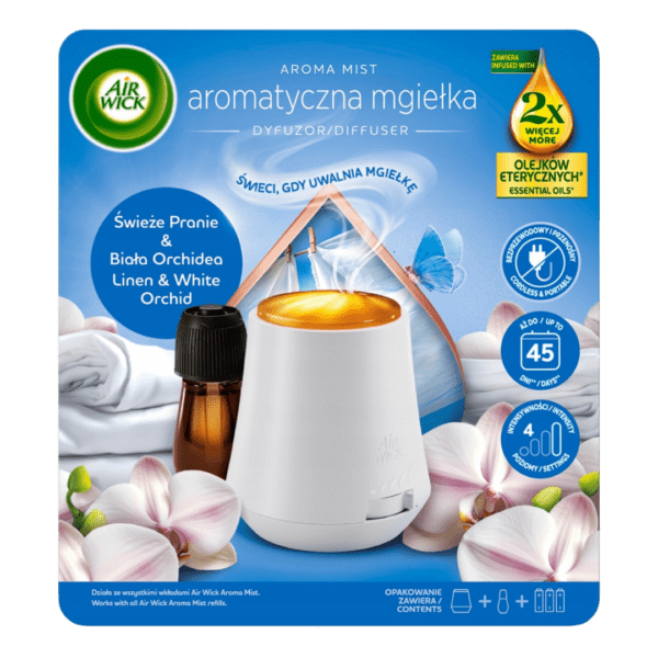 Chcesz, aby Twój dom zawsze pachniał jak świeżo wyprana pościel? Air Wick Essential Mist to bezprzewodowy dyfuzor, który zamienia naturalne olejki eteryczne w delikatną mgiełkę. Połączenie Białej Orchidei i Świeżego Prania zapewni Ci do 45 dni relaksu. 3 poziomy intensywności, cicha praca i elegancki design. Wprowadź zapach czystości do swojego wnętrza już dziś!