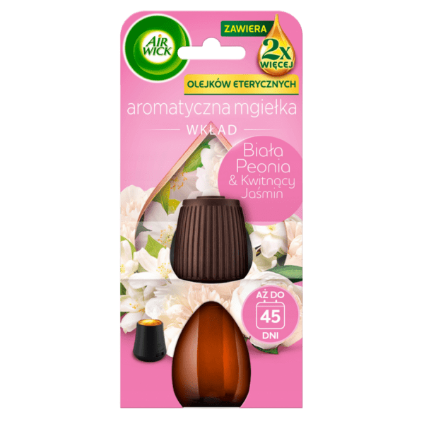 Tęsknisz za zapachem świeżych kwiatów? Wkład Air Wick Essential Mist to esencja Białej Peonii i Jaśminu zamknięta w naturalnych olejkach. Innowacyjna technologia suchej mgiełki nasyca powietrze aromatem bez osadów na meblach. Ciesz się relaksem do 45 dni dzięki inteligentnemu systemowi uwalniania zapachu. Podaruj sobie chwilę luksusu każdego dnia!