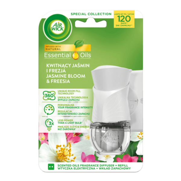 Twoje mieszkanie potrzebuje szlachetnej oprawy? Elektryczny Air Wick Kwitnący Jaśmin i Frezja to krystalicznie czysty aromat oparty na roślinnych ekstraktach. 5 poziomów regulacji, zero gazów pędnych i aż 120 dni działania na jednym wkładzie. Bezpieczny, bezobsługowy i niezwykle elegancki. Wepnij do kontaktu i zamień swój dom w kwitnący ogród już po kilku minutach!