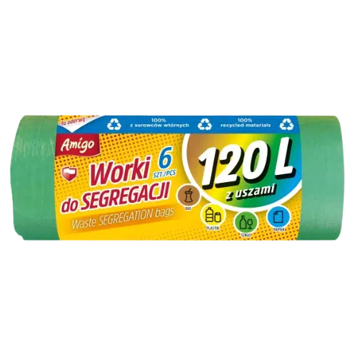 Amigo Worki do Segregacji 120L Zielone to wytrzymałe worki stworzone z myślą o przechowywaniu i transporcie szklanych odpadów. Duża pojemność oraz solidny materiał sprawiają, że są niezastąpione wszędzie tam, gdzie generuje się większą ilość szkła – w domu, gastronomii czy przedsiębiorstwach. Zielony kolor jednoznacznie wskazuje frakcję szkła, ułatwiając prawidłową segregację.