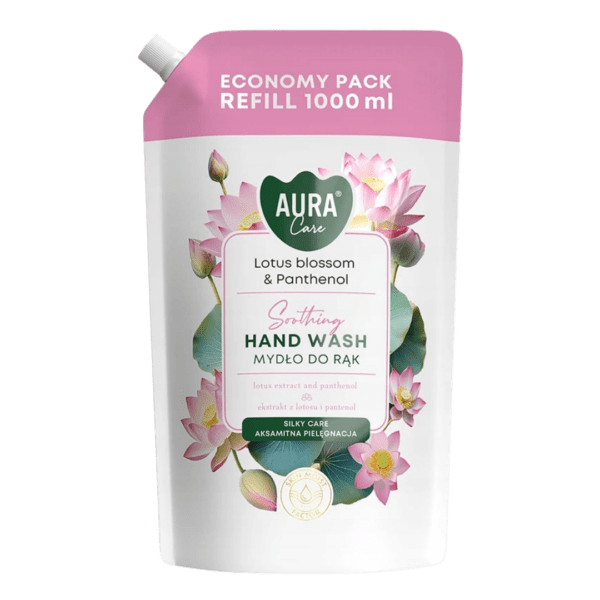 Częste mycie wysusza Twoje dłonie? Zmień mydło na kremową, perłową formułę AURA Kwiat Lotosu i Pantenol! Ekologiczny zapas 1L (doypack) to oszczędność pieniędzy i ulga dla natury. Neutralne pH i całkowity brak mikroplastiku gwarantują bezpieczeństwo dla skóry. Zadbaj o jedwabiście gładkie dłonie i relaksujący, subtelny zapach w Twojej łazience