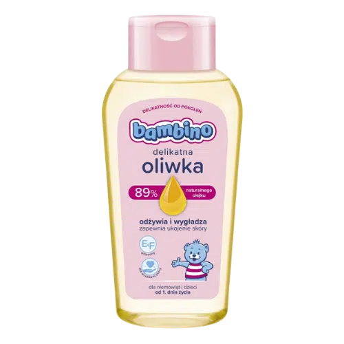 Bambino Oliwka Pielęgnacyjna to delikatny kosmetyk przeznaczony do codziennej pielęgnacji skóry niemowląt i dzieci już od pierwszego dnia życia. Zawiera aż 89% naturalnych olejków oraz witaminę F, która wspomaga nawilżenie skóry i chroni ją przed utratą wody. Oliwka doskonale sprawdza się po kąpieli oraz podczas masażu, pozostawiając skórę miękką, elastyczną i odżywioną.