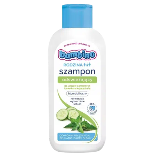 Odświeżający szampon Bambino Rodzina został zaprojektowany z myślą o codziennej pielęgnacji włosów całej rodziny. Formuła wzbogacona naturalnymi ekstraktami skutecznie oczyszcza włosy i skórę głowy, redukując przetłuszczanie się i przywracając uczucie świeżości. Produkt nie zawiera silikonów, co sprawia, że jest delikatny dla włosów i skóry, a dodatkowo nie podrażnia oczu.
