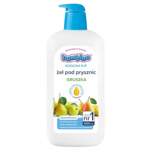 Bambino Rodzina Żel pod Prysznic o zapachu gruszki to łagodny kosmetyk stworzony z myślą o codziennej pielęgnacji skóry dorosłych i dzieci (od 3 lat). Oczyszcza bez wysuszania i podrażnień, dzięki formule wzbogaconej o oliwkę Bambino i pantenol. Pozostawia skórę miękką, gładką i przyjemnie pachnącą.