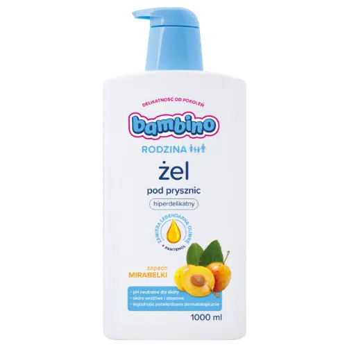 Bambino Rodzina Żel pod Prysznic 1000ml Mirabelka to idealny produkt dla całej rodziny, łączący skuteczne oczyszczanie z delikatną pielęgnacją. Jego łagodna formuła została opracowana tak, by zapewnić skórze odpowiednie nawilżenie i ochronę przed przesuszeniem. Owocowy zapach mirabelki nadaje codziennej kąpieli przyjemny, orzeźwiający charakter, a duża pojemność butelki gwarantuje długotrwałe użytkowanie.