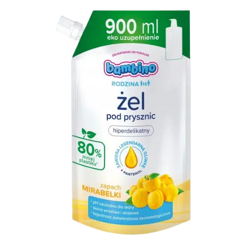 Bambino Rodzina Żel pod Prysznic 900ml Zapas Mirabelka to idealny wybór dla całej rodziny, który łączy skuteczne oczyszczanie z delikatną pielęgnacją skóry. Dzięki łagodnej formule żel doskonale myje, nie powodując podrażnień, a świeży, owocowy aromat mirabelki sprawia, że codzienny prysznic staje się przyjemnym rytuałem. Produkt w praktycznym opakowaniu typu zapas to ekonomiczne i ekologiczne rozwiązanie do codziennego stosowania.
