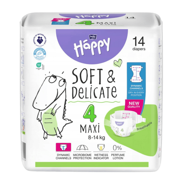Twój maluch zaczyna raczkować i stawiać pierwsze kroki? Wybierz Pieluszki Bella Happy Soft & Delicate Maxi 4 (14 szt.)! Elastyczne boczki pracują razem z dzieckiem, a Dynamiczne Kanały Chłonne zapobiegają zbrylaniu. W 100% bezpieczny skład bez chloru i perfum. Mała paczka – idealna do wózka i auta! Zaufaj polskiej jakości. Kup teraz!