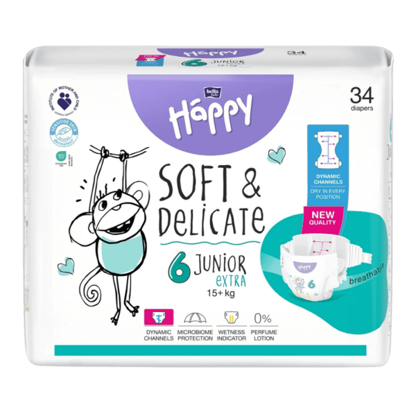Twój starszak budzi się w nocy z mokrą piżamką? Wybierz Pieluszki Bella Happy Soft & Delicate Junior Extra 6 (34 szt.)! Zapewniają ekstremalną chłonność dla dzieci powyżej 15 kg. Pełna oddychalność i 0% chemii (bez chloru i perfum) to brak odparzeń. Dynamiczne Kanały chłonne chronią przed zbrylaniem. Zamów polską jakość z certyfikatem Instytutu Matki i Dziecka!