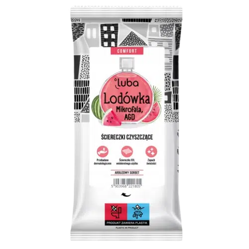 Luba Comfort to nawilżane ściereczki czyszczące, idealne do lodówki, mikrofali i sprzętu AGD, z długotrwałym zapachem Watermelon Sorbet. Ściereczki skutecznie usuwają zaschnięte resztki jedzenia, tłuste plamy i inne zabrudzenia, pozostawiając powierzchnie czyste i lśniące, bez smug. Duże, wytrzymałe ściereczki w formacie XXL umożliwiają czyszczenie większych powierzchni.