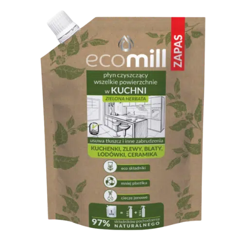 Ecomill płyn czyszczący do kuchni zapas o zapachu zielonej herbaty to skuteczny i jednocześnie przyjazny środowisku preparat do codziennego sprzątania kuchni. Formuła efektywnie usuwa tłuszcz, plamy oraz osady z blatów roboczych, kuchenek, zlewów i innych powierzchni kuchennych, pozostawiając je czyste i bez smug. Delikatny, świeży aromat zielonej herbaty wprowadza przyjemną atmosferę, a ekologiczny charakter produktu sprawia, że jest to świadomy wybór do domu.
