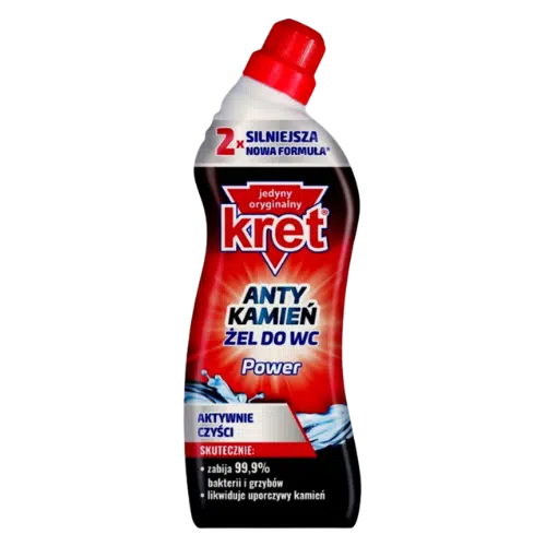Kret Żel do WC Power 750g to skuteczny i wydajny środek czyszczący, stworzony z myślą o kompleksowej higienie toalety. Dzięki innowacyjnej formule żel skutecznie usuwa zabrudzenia, osady z kamienia, rdzę oraz nieprzyjemne zapachy, pozostawiając powierzchnię idealnie czystą i lśniącą. Jego gęsta konsystencja zapewnia długotrwałe działanie – zarówno nad, jak i pod powierzchnią wody, gwarantując pełną czystość i świeżość w całej toalecie.