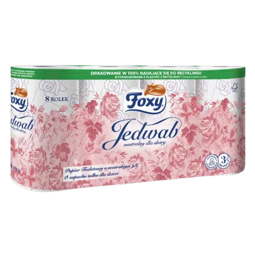 Foxy Jedwab Papier Toaletowy 8 Rolek to trójwarstwowy papier wykonany w 100% z naturalnej celulozy, zaprojektowany z myślą o najwyższym komforcie użytkowania. Dzięki specjalnemu procesowi mikrogofrowania, papier jest niezwykle miękki i delikatny, co czyni go idealnym dla osób z wrażliwą skórą. Neutralne pH oraz subtelny zapach talku dla dzieci, aplikowany do wnętrza tekturowej tulei, zapewniają przyjemne odczucie świeżości i czystości bez bezpośredniego kontaktu ze skórą. Produkt został przetestowany dermatologicznie, co potwierdza jego bezpieczeństwo nawet dla najbardziej wrażliwej skóry.