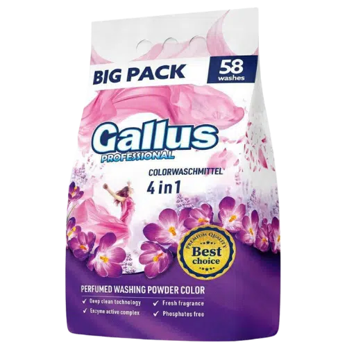 Gallus proszek do prania kolorów 4w1 to wydajny detergent stworzony specjalnie do pielęgnacji tkanin kolorowych. Innowacyjna formuła z aktywnymi enzymami wnika głęboko we włókna, skutecznie usuwając uporczywe plamy i zabrudzenia, a jednocześnie chroniąc intensywność kolorów. Ubrania po praniu zachowują świeży wygląd i przyjemny zapach.