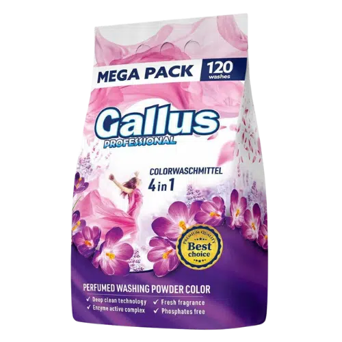Gallus Professional 4w1 proszek do prania do koloru to wydajny detergent przeznaczony do prania tkanin kolorowych oraz białych. Zaawansowana formuła z aktywnymi enzymami wnika głęboko we włókna, skutecznie usuwając zabrudzenia i plamy, jednocześnie dbając o strukturę materiałów. Proszek zapewnia doskonałe efekty prania w zakresie temperatur od 20 do 60°C oraz pozostawia ubrania przyjemnie świeże.