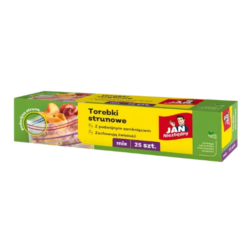 Jan Niezbędny Torebki Strunowe Mix to wszechstronne, trwałe i wielokrotnego użytku torebki z zamknięciem strunowym, idealne do przechowywania żywności i drobnych przedmiotów. Dzięki szczelnemu zamknięciu doskonale chronią zawartość przed wilgocią, powietrzem i zanieczyszczeniami, utrzymując świeżość produktów na dłużej.