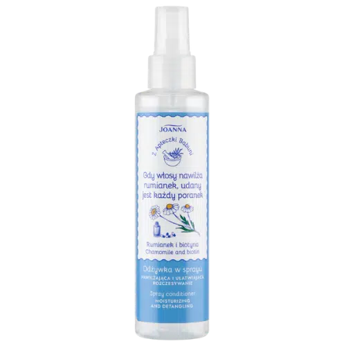Odżywka nawilżająca w sprayu Z Apteczki Babuni Joanna to produkt inspirowany tradycjami medycyny ludowej, stworzony z myślą o włosach cienkich i delikatnych. Zawiera naturalne składniki, takie jak rumianek i biotyna, które skutecznie wzmacniają włosy, dodając im zdrowego blasku i ułatwiając rozczesywanie.
