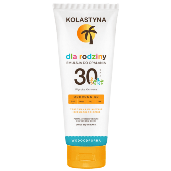 Zadbaj o bezpieczeństwo swoje i swoich bliskich z poręczną, mini emulsją rodzinną Kolastyna SPF 30 (80 ml). Ten uniwersalny kosmetyk został stworzony, aby sprostać potrzebom skóry zarówno dzieci, jak i dorosłych. Zaawansowana, wodoodporna formuła zapewnia szerokopasmową ochronę przed czterema rodzajami promieniowania: UVA, UVB, IRA oraz VL. Dzięki temu minimalizuje ryzyko poparzeń oraz przedwczesnego starzenia się naskórka, dbając o zdrowy wygląd skóry podczas wakacyjnych przygód.