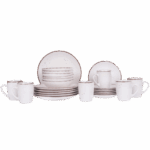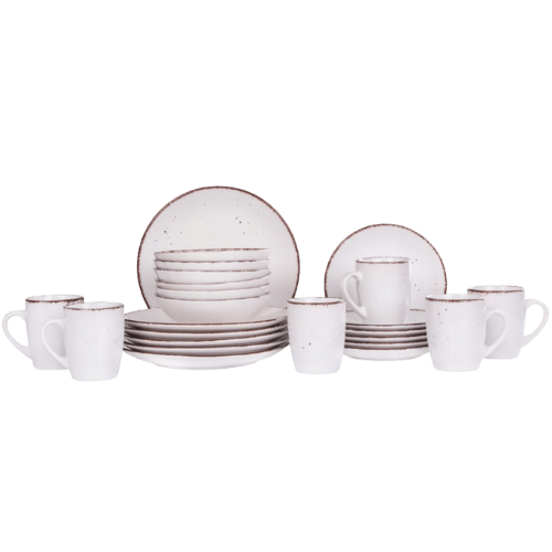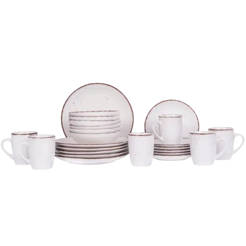 Biały serwis obiadowy Kamionka 24-elementowy to idealne połączenie klasyki i nowoczesnych trendów. Wykonany z wysokiej jakości ceramiki szkliwionej, zachwyca delikatnym nakrapianym wzorem oraz przecieranym, brązowym rantem, który nadaje mu rustykalnego uroku. Komplet został zaprojektowany z myślą o codziennym użytkowaniu, a jednocześnie świetnie prezentuje się podczas wyjątkowych okazji. Dzięki solidnej konstrukcji i grubszym brzegom naczynia są odporne na uszkodzenia, a gładka, szkliwiona powierzchnia zapewnia łatwe czyszczenie i trwały połysk.