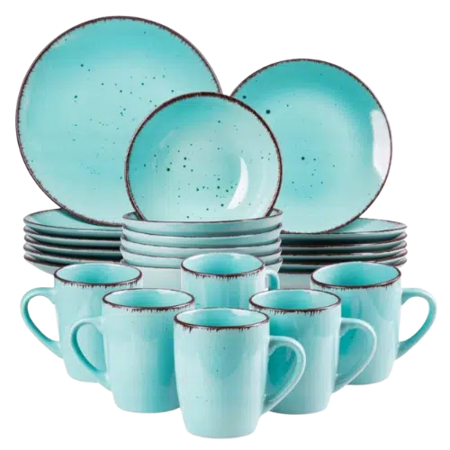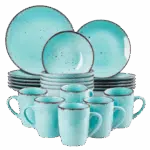 Zestaw obiadowy Prima Deco Kamionka to wyjątkowe połączenie elegancji i funkcjonalności. Wykonany z wysokiej jakości ceramiki kamionkowej, zachwyca solidnością i ponadczasowym wyglądem. Turkusowy kolor z subtelnym, nakrapianym wzorem wprowadza do wnętrza naturalny urok i wyjątkowy charakter. Każdy element został pokryty szkliwem ochronnym, które nadaje mu gładką, lśniącą powierzchnię oraz chroni przed zarysowaniami. Zestaw składa się z 24 elementów, obejmujących talerze obiadowe, głębokie, deserowe oraz kubki, co pozwala na komfortowe serwowanie posiłków dla 6 osób. Dzięki możliwości mycia w zmywarce i użytkowania w kuchence mikrofalowej, komplet jest nie tylko estetyczny, ale i wyjątkowo praktyczny.
