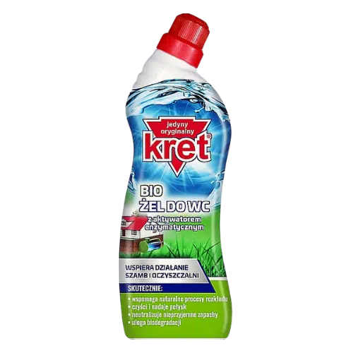 Kret Bio Żel do WC z aktywatorem enzymatycznym to nowoczesne i skuteczne rozwiązanie do utrzymania higienicznej czystości w toalecie, przy jednoczesnej trosce o środowisko. Zaawansowana formuła oparta na enzymach efektywnie usuwa zabrudzenia, neutralizuje nieprzyjemne zapachy oraz zapobiega osadzaniu się zanieczyszczeń i zapychaniu rur. Produkt jest w pełni bezpieczny dla flory bakteryjnej w szambach i przydomowych oczyszczalniach ścieków.