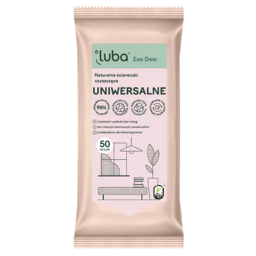 Luba EcoDom Ściereczki Czyszczące Uniwersalne to ekologiczne, nawilżane ściereczki przeznaczone do codziennego sprzątania różnych powierzchni w domu. Dzięki formule opartej w 96% na składnikach pochodzenia naturalnego, skutecznie czyszczą i odświeżają, jednocześnie pozostając przyjazne dla środowiska.