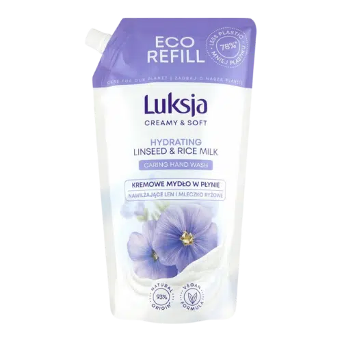 Luksja Creamy & Soft Mydło w Płynie Nawilżające Len i Mleczko Ryżowe Zapas 900 ml to delikatne i kremowe mydło, stworzone z myślą o codziennej pielęgnacji skóry. Formuła z ekstraktem z lnu i mleczkiem ryżowym łagodnie oczyszcza skórę, jednocześnie zapewniając jej miękkość i nawilżenie. 93% składników pochodzenia naturalnego sprawia, że jest to wybór przyjazny dla skóry i środowiska. Produkt jest biodegradowalny, wegański i testowany dermatologicznie – odpowiedni także dla skóry wrażliwej.
