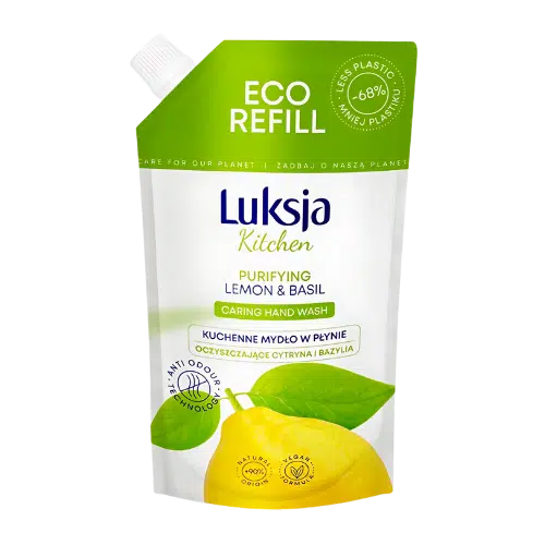 Kuchenne mydło w płynie Luksja o zapachu cytryny i bazylii zawiera środki myjące pochodzenia roślinnego, zapewniając skuteczne oczyszczenie skóry. To doskonałe rozwiązanie do kuchni, które neutralizuje nieprzyjemne zapachy, takie jak woń czosnku, cebuli czy ryby, dzięki specjalnemu składnikowi.