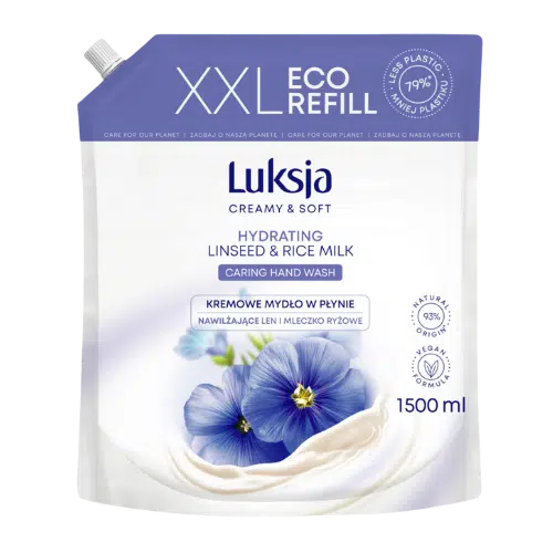 Luksja Mydło w Płynie Zapas XXL Len i Mleczko Ryżowe 1500 ml to delikatne, a zarazem skuteczne mydło do rąk, które dzięki zawartości mleczka ryżowego i ekstraktu z lnu nawilża, zmiękcza i koi skórę. Idealne do codziennego stosowania – łagodnie oczyszcza, nie naruszając naturalnej bariery ochronnej skóry. Aż 93% składników pochodzenia naturalnego, biodegradowalna formuła bez parabenów oraz certyfikowany skład wegański sprawiają, że to doskonały wybór dla całej rodziny. Duże opakowanie XXL 1500 ml pozwala na długie użytkowanie i uzupełnianie dozowników bez konieczności częstych zakupów.