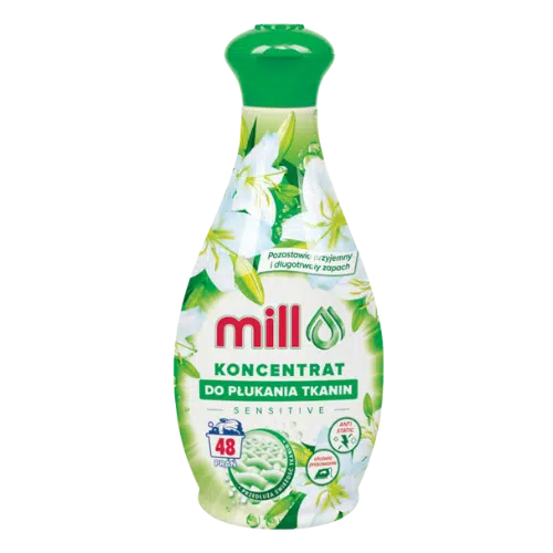 Mill Koncentrat do Płukania Tkanin Sensitive to łagodny, a jednocześnie skuteczny środek do płukania, stworzony z myślą o osobach o wrażliwej skórze oraz dzieciach. Delikatna formuła poprawia komfort noszenia ubrań, zapewniając im wyjątkową miękkość, świeżość oraz redukcję elektryzowania się tkanin. Koncentrat skutecznie usuwa resztki detergentów, dbając o bezpieczeństwo skóry i jakość prania.