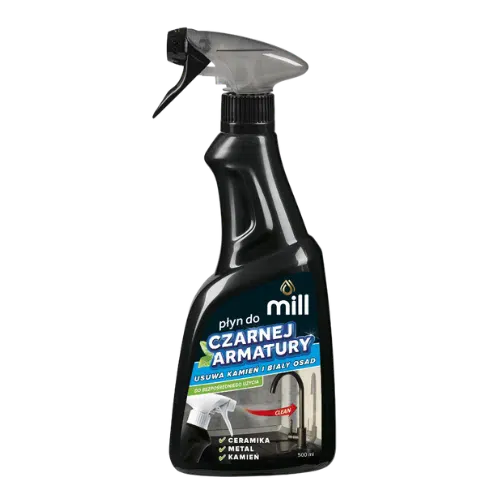 Mill Płyn Do Czyszczenia Czarnej Armatury to specjalistyczny preparat przeznaczony do pielęgnacji matowych oraz błyszczących powierzchni w kolorze czarnym. Skutecznie usuwa osady z kamienia, mydła i wody, nie pozostawiając smug ani zacieków, a jednocześnie chroni armaturę przed matowieniem i utratą estetycznego wyglądu.