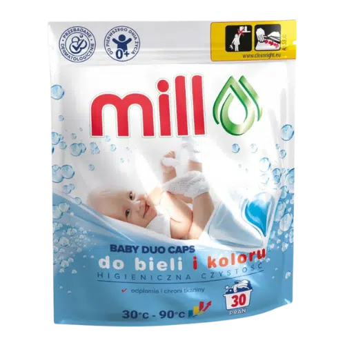 Dla kompleksowej pielęgnacji prania dziecięcego z tej samej linii warto wypróbować również Mill Baby Duo Caps kapsułki do prania do bieli i koloru 50 sztuk, który dodatkowo zmiękcza tkaniny i ułatwia prasowanie.
