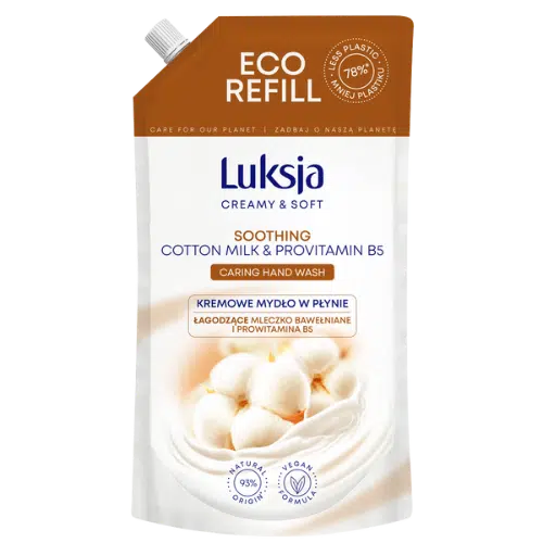 Luksja Creamy & Soft Mydło w Płynie Mleczko Bawełniane i Prowitamina B5 Zapas 900 ml to kremowe mydło w płynie, które skutecznie oczyszcza skórę, zapewniając jej natychmiastową miękkość i nawilżenie. Zawiera mleczko bawełniane oraz prowitaminę B5, znane ze swoich właściwości łagodzących i pielęgnacyjnych. Formuła mydła oparta jest w 93% na składnikach pochodzenia naturalnego, jest biodegradowalna i wegańska. Produkt został przebadany dermatologicznie i jest odpowiedni dla każdego rodzaju skóry, w tym wrażliwej.