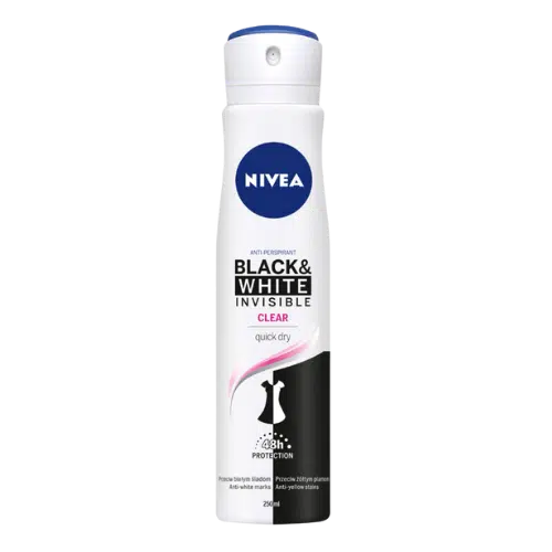 NIVEA Black & White Invisible Clear 250 ml to antyperspirant stworzony dla osób, które oczekują skutecznej ochrony przed potem i zapachem, bez ryzyka powstawania żółtych plam na jasnych ubraniach ani białych śladów na ciemnych. Innowacyjna formuła 5w1 zapewnia długotrwałą świeżość i komfort każdego dnia.