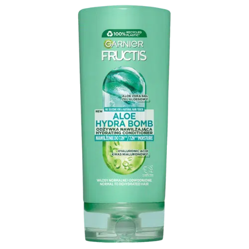 Garnier Fructis Aloe Hydra Bomb to nawilżająca odżywka, która dzięki połączeniu żelu aloesowego i kwasu hialuronowego zapewnia intensywne nawilżenie włosów, trwające nawet do 72 godzin. Innowacyjna formuła nie obciąża włosów, pozostawiając je lekkie, miękkie w dotyku i pełne blasku. Jej skuteczność została potwierdzona w testach instrumentalnych, szczególnie przy stosowaniu razem z szamponem z tej samej linii.