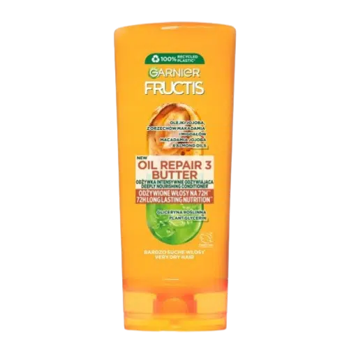 Garnier Fructis Oil Repair 3 to odżywka stworzona specjalnie z myślą o włosach suchych i łamliwych. Łączy moc trzech naturalnych olejków: z awokado, kokosa i oliwek, z keratyną roślinną, aby skutecznie nawilżać i regenerować włosy. Bogata, ale lekka formuła głęboko odżywia włosy, przywracając im zdrowy blask i elastyczność, jednocześnie ułatwiając ich rozczesywanie.