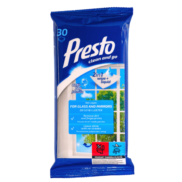 Czyste lustra, idealnie przejrzyste okna i lśniące szklane blaty bez grama wysiłku? Z nawilżanymi ściereczkami Presto (30 sztuk) to zadanie na zaledwie kilka sekund! Ten innowacyjny, gotowy do użycia produkt błyskawicznie i niezwykle skutecznie usuwa codzienne zabrudzenia oraz uciążliwe odciski palców. Zapomnij o noszeniu ciężkich butelek z płynami i wycieraniu powierzchni papierowymi ręcznikami – wyciągnij ściereczkę, przetrzyj szkło i ciesz się nieskazitelnym blaskiem!