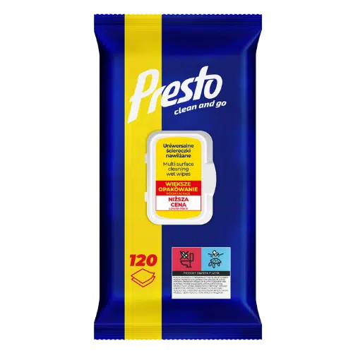 Presto Ściereczki Nawilżane Uniwersalne Pop Up 120 szt. to praktyczne i higieniczne rozwiązanie do codziennego sprzątania. Przeznaczone do czyszczenia różnych powierzchni gładkich, takich jak meble laminowane, plastik, ceramika, blaty kuchenne i inne. Skutecznie usuwają zabrudzenia, pozostawiając powierzchnie czyste i błyszczące. Wygodne opakowanie z funkcją pop-up zapewnia komfort użytkowania i łatwe dozowanie. Dzięki delikatnej formule ściereczki są bezpieczne dla skóry dłoni. Do specjalistycznego czyszczenia powierzchni kuchennych warto wybrać także Presto Ściereczki Nawilżane do Kuchni Pop Up 55 Szt., idealne do usuwania tłuszczu i osadów.