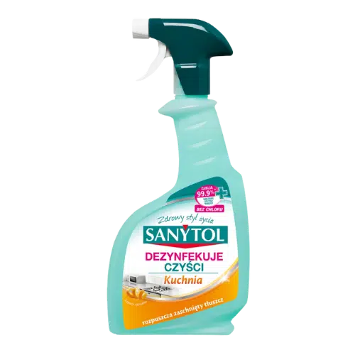 Sanytol Spray do Kuchni 500 ml to skuteczny środek czyszczący, który łączy w sobie potrójne działanie: dezynfekuje, odtłuszcza i neutralizuje nieprzyjemne zapachy. Eliminuje 99,9% bakterii, wirusów i grzybów, w tym wirusa H1N1, pozostawiając powierzchnie czyste i bezpieczne. Formuła bez chloru oraz świeży cytrusowy zapach sprawiają, że produkt jest przyjemny w użyciu i odpowiedni do codziennego stosowania w kuchni.