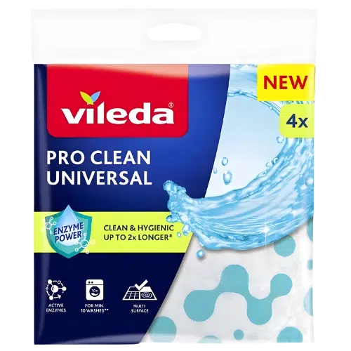 Ścierka Vileda Pro Clean z enzymami to nowoczesne rozwiązanie, które łączy skuteczność mikrofibry z naturalną mocą enzymów. Dzięki zawartości 30% mikrofibry doskonale usuwa kurz, zabrudzenia i tłuszcz, pozostawiając powierzchnie idealnie czyste, bez smug i zarysowań. Enzymy aktywnie rozkładają resztki brudu, co sprawia, że ściereczka pozostaje świeża i higieniczna nawet po wielu użyciach.