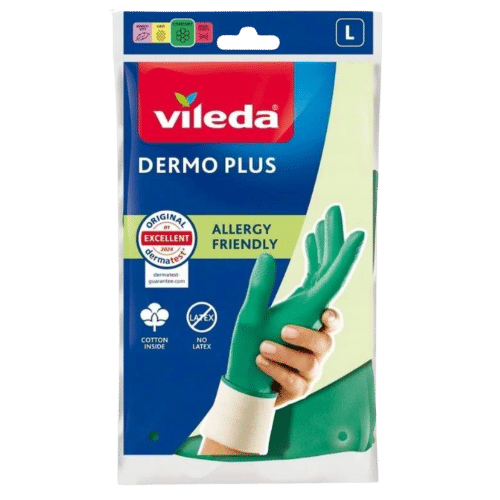 Dzięki certyfikatowi Dermatest rękawice Vileda Dermo Plus gwarantują bezpieczeństwo dla skóry i potwierdzoną hipoalergiczność. Od wewnątrz wyściełane są miękką bawełnianą warstwą, która pochłania wilgoć, zapobiega otarciom i utrzymuje dłonie suche przez cały czas pracy.