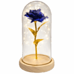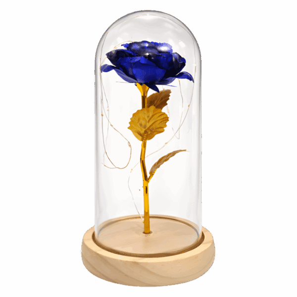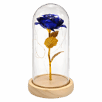 Wieczna niebieska róża LED metalizowana to wyjątkowa dekoracja, która zachwyca nowoczesnym kolorem i eleganckim wykończeniem. Metalizowany niebieski kwiat, osadzony na drewnianej podstawie i zamknięty w przezroczystej kopule, stanowi stylowy akcent dekoracyjny do domu, pokoju lub biura. Delikatne oświetlenie LED tworzy przytulny, nastrojowy klimat, idealny na wyjątkowe chwile.