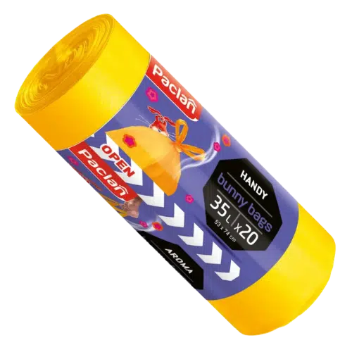 Paclan Worki na Śmieci Bunny Bags 35L – 20 sztuk to praktyczne i estetyczne worki do mniejszych koszy, które łączą funkcjonalność z przyjaznym wyglądem. Dzięki specjalnie zaprojektowanym „uszom” można je łatwo i higienicznie zawiązać, bez kontaktu z zawartością. Wykonane z trwałej folii LDPE, są odporne na przeciekanie i rozerwania. Ich kolorowe wykończenie sprawia, że doskonale sprawdzą się w pokojach dziecięcych, łazienkach czy biurach.