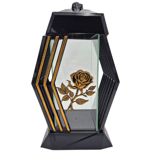 Znicz Szklany Lamel Kameleon Róża Złoty to elegancki lampion nagrobny w nowoczesnej formie. Wykonany z solidnego szkła i tworzywa sztucznego, zdobiony złotą różą, która podkreśla jego wyjątkowy charakter. Dzięki efektowi „kameleona” prezentuje się dostojnie i stanowi stylowy sposób upamiętnienia bliskich.