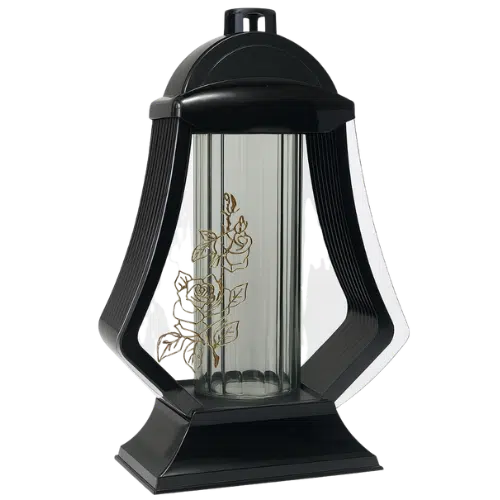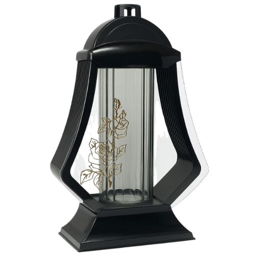 Znicz Lampion w kolorze czarnym to elegancki i ponadczasowy model, który pięknie podkreśla powagę i charakter miejsca pamięci. Wykonany z trwałego tworzywa sztucznego i szkła, został ozdobiony subtelnym złotym motywem róży, nadającym mu wyjątkowej symboliki.