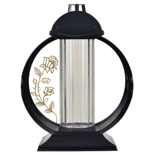 Znicz Szklany Medalion Czarny to klasyczny lampion nagrobny o eleganckiej, okrągłej formie. Wykonany z połączenia szkła i trwałego tworzywa sztucznego w czarnej kolorystyce, zdobiony subtelnym motywem złotej róży. Symetryczny kształt i solidna konstrukcja sprawiają, że znicz prezentuje się estetycznie na każdym nagrobku, będąc symbolicznym wyrazem pamięci o bliskich.