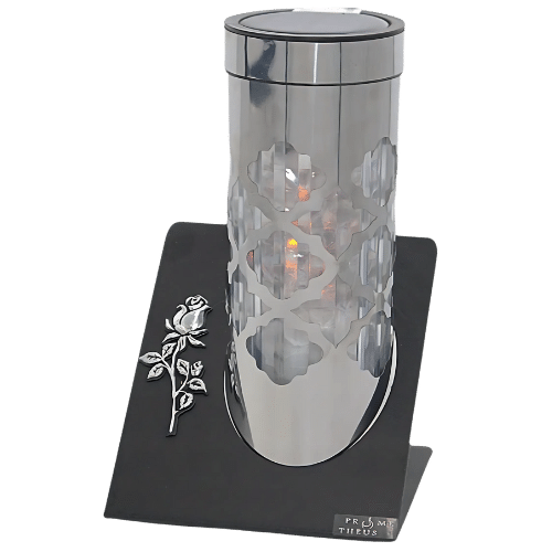 Znicz Solarny LED Chromowany Paris B to stylowy i trwały lampion nagrobny, który łączy nowoczesną technologię z eleganckim wyglądem. Wykonany z wysokiej jakości stali chromowanej, wyróżnia się srebrnym, lustrzanym wykończeniem i solidną konstrukcją odporną na działanie czynników atmosferycznych.