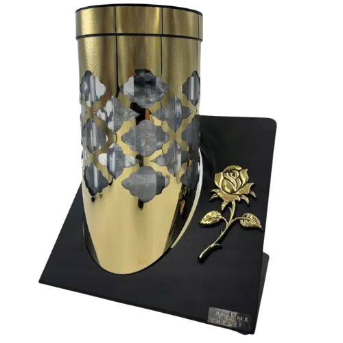 Znicz Solarny Paris C Gold to nowoczesny i stylowy lampion nagrobny, który łączy elegancję z funkcjonalnością. Wykonany z wysokiej jakości stali w kolorze złotym, osadzony na czarnej podstawce, ozdobiony subtelną złotą różą. Dzięki technologii solarnej nie wymaga wkładów ani baterii – ładuje się energią słoneczną, zapewniając światło przez cały rok, niezależnie od warunków pogodowych.